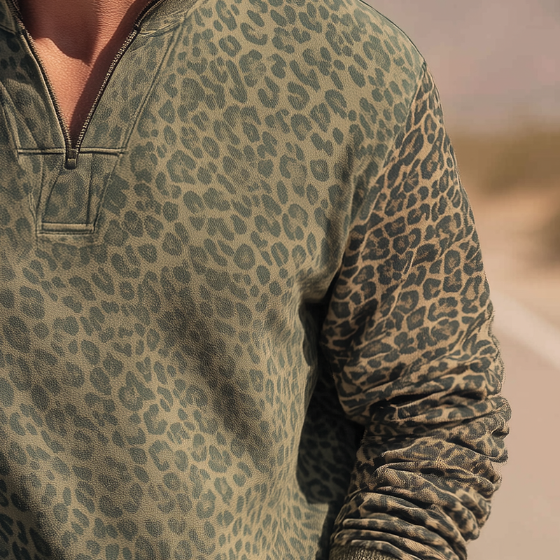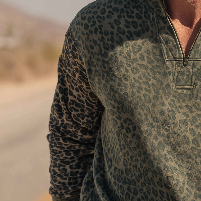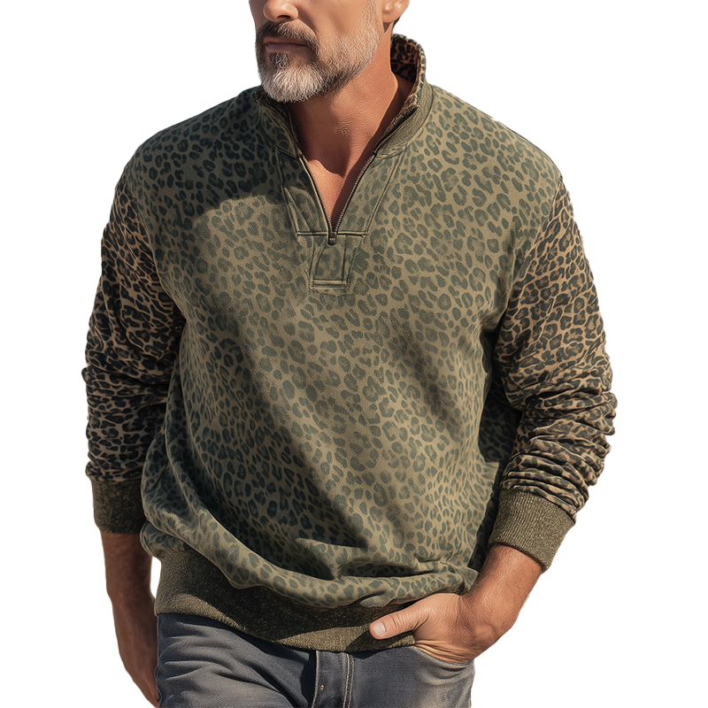 In summation, the Men's Vintage Leopard Print Cotton Blend Stand Collar Sweatshirt is an ideal mix of comfort and style. Its unique design makes it a standout piece that enhances any outfit. Add this to your wardrobe for an easy yet stylish fashion statement.