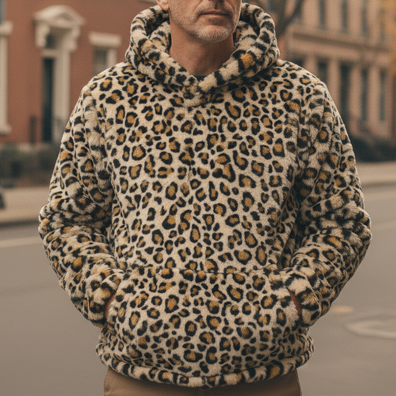 Men's Retro Casual Street Style Warm Leopard Print Plush Hoodie MTA2443I1TO