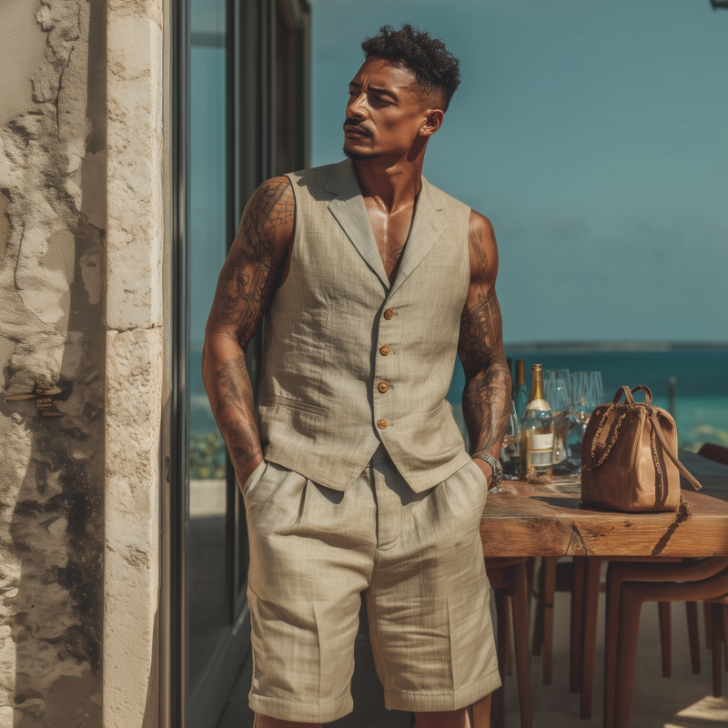 The Men’s Casual Breathable Solid Color Cotton Linen Notched Lapel Single-breasted Slim-fit Suit Vest Shorts Set offers a stylish and comfortable summer ensemble, perfect for outdoor events, smart casual occasions, or relaxed parties. Crafted from a lightweight, breathable cotton-linen blend fabric, this set features a tailored vest with a notched lapel, a matching pair of shorts, and a slim-fit silhouette that provides a contemporary, polished appearance. Its understated elegance, high-quality material, and versatile styling make it an ideal choice for men who want to combine sophistication with comfort in warm weather.